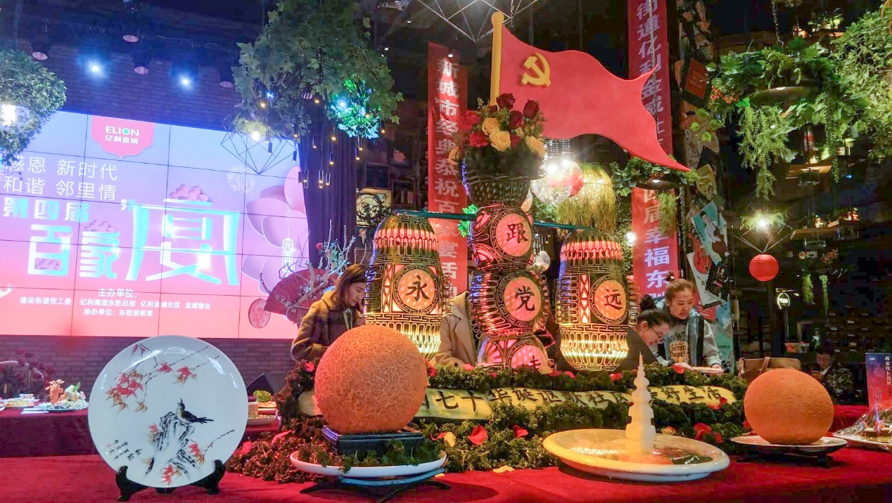 2019年社區(qū)百家宴以“感恩新時(shí)代 和諧鄰里情”為主題,將傳統(tǒng)文化、飲食文化與歌頌黨、歌唱祖國和展現(xiàn)社區(qū)的新氣象、新面貌結(jié)合起來,通過菜品展示品嘗、演藝活動(dòng)、居民互動(dòng)聯(lián)歡等形式增進(jìn)居民交流,營造節(jié)日氣氛,活躍社區(qū)文化。社區(qū)黨組織專門邀請(qǐng)10位與共和國同齡的70歲老人,共慶盛世華誕。同時(shí)邀請(qǐng)20位環(huán)衛(wèi)工人、片區(qū)民警、物業(yè)人員代表,感謝他們?cè)诤椭C社區(qū)建設(shè)中默默無聞的奉獻(xiàn)。